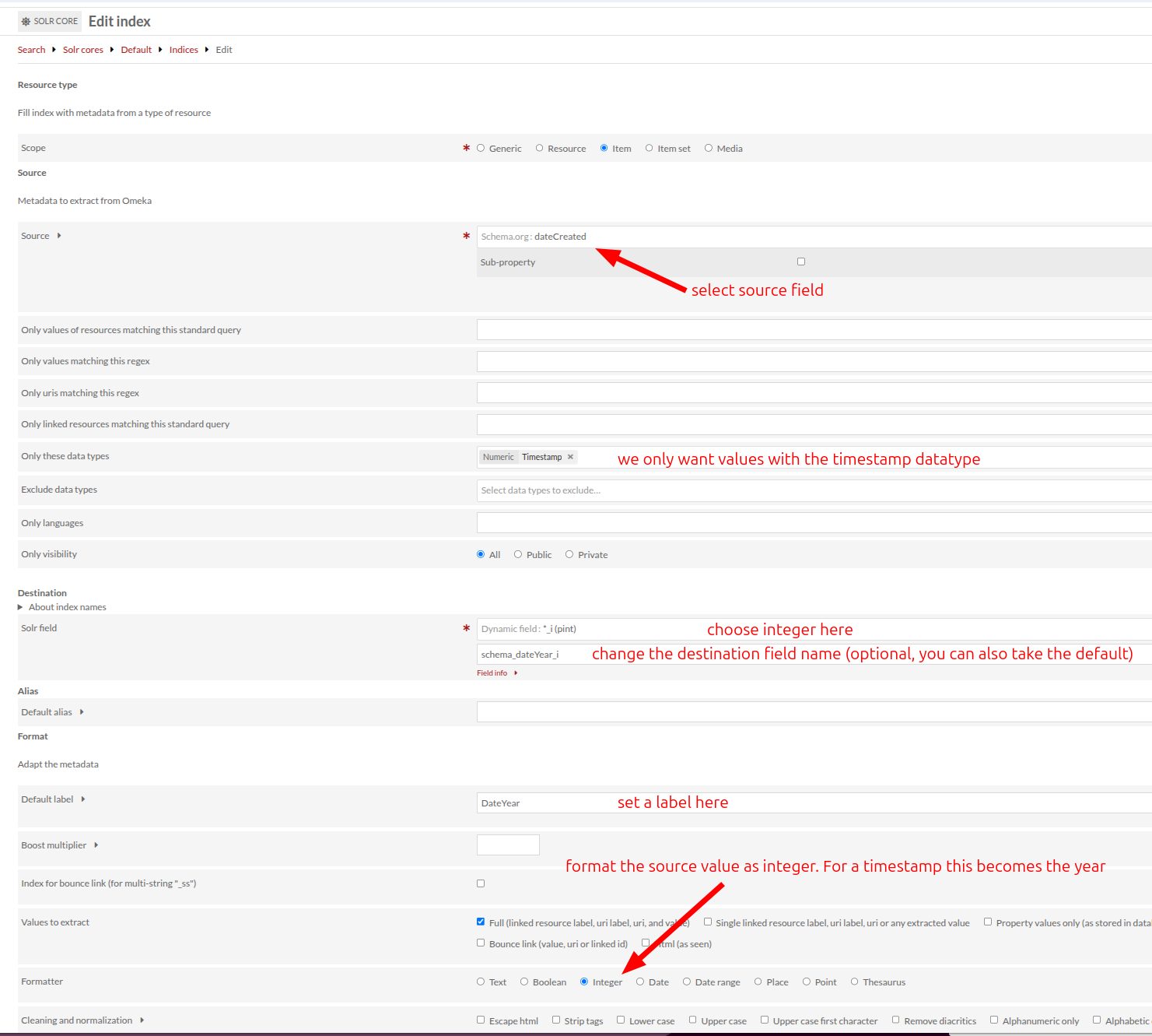 My date values are indexed as _s, _ss, _txt, _dt, and _dts. I’ve tried _dts and _ss. The dcterms:created field uses the numeric timestamp data type.