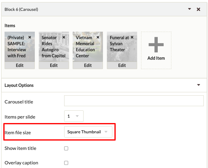 You’re probably using “Full Size” in the “Item file size” option under the Carousel Layout Options. You can change this to a more convenient option like “Square Thumbnail” or “Thumbnail”: