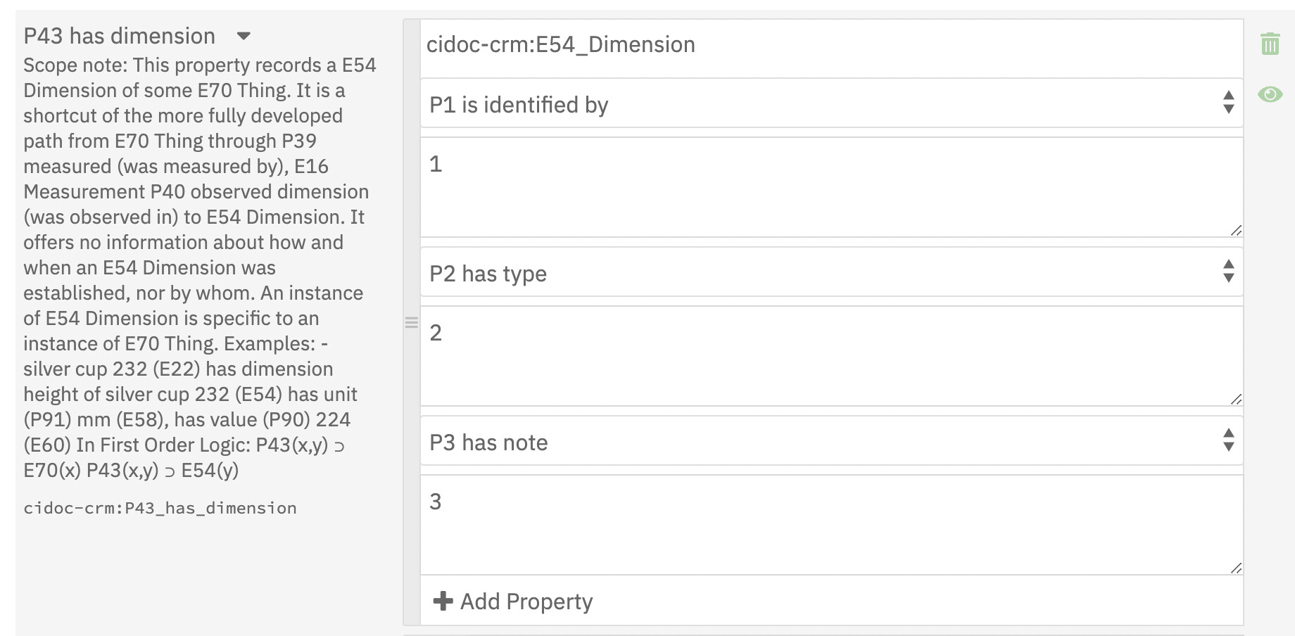 For instance if i create an item with the E24 Class ( Physical man made thing), i can then insert a field with the P1 Property ( is identified by), and then i can add a literal as text to fill the field.