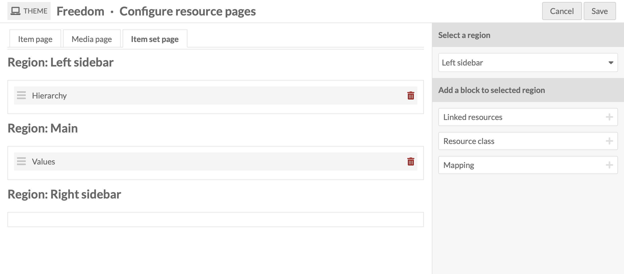 I think I understand the issue, but I’m surprised the Configure Resource Page Item Set tab isn’t working–when I have mine set like so for the Freedom theme, it’s aligning the Hierarchy block in the Left Column Region with the item listing in the Center Region :