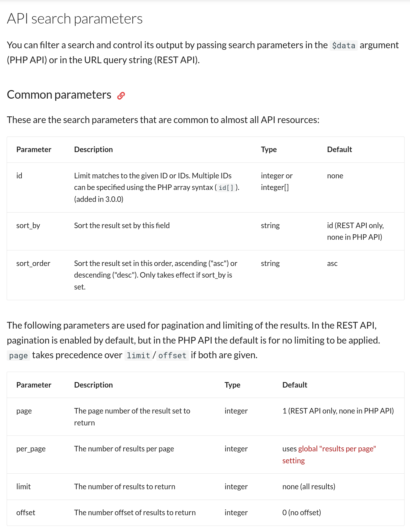 I’ll look at adding something to the dev docs to make it clearer that the args you pass to the PHP API are an array, not a string. (edit: actually I think the docs are pretty much okay here already… the PHP API page says that $data is an array, and the reference page you linked notes that pagination “beats” limit and that pagination is default-on for the REST API).